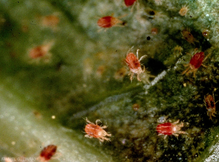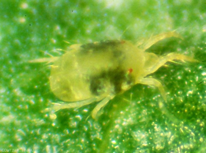 L’adulte est globuleux, ovoïde. La longueur des femelles est de 0,5 mm, celle des mâles de 0,3 mm. Cet acarien est jaune clair à vert sale avec deux taches sombres (figure 1). Il existe une forme rouge, Tetranychus cinnabarinus (figure 2).