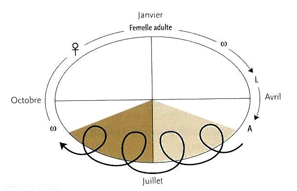 L’hibernation se fait à l’état de femelles adultes orangées qui s’abritent dans les anfractuosités des écorces, sur les plantes basses et dans le sol. Le début de la ponte a lieu au printemps quand la température dépasse 18 °C.