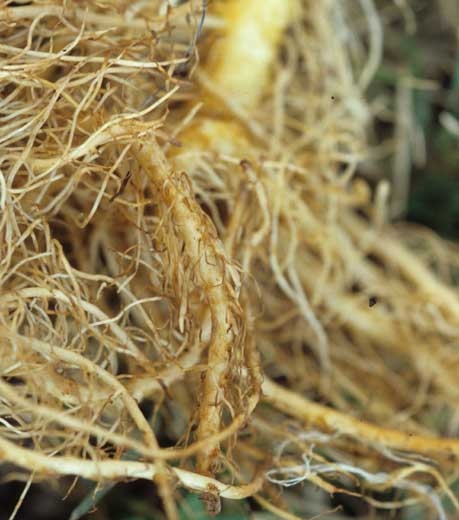 - Contextes d'expression : ces symptômes peuvent être observés à la suite d'une mauvaise utilisation d'engrais azotés ou d'un activateur de décomposition de la matière organique. Les lésions racinaires peuvent être généralisées ou localisées à la zone du système racinaire correspondant à l'emplacement de l'engrais. Sols frais, compactés, gorgés d'eau, nitrification trop lente, pH du sol trop acide, fertilisation trop importante, etc.