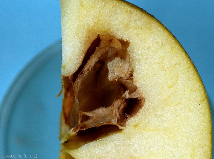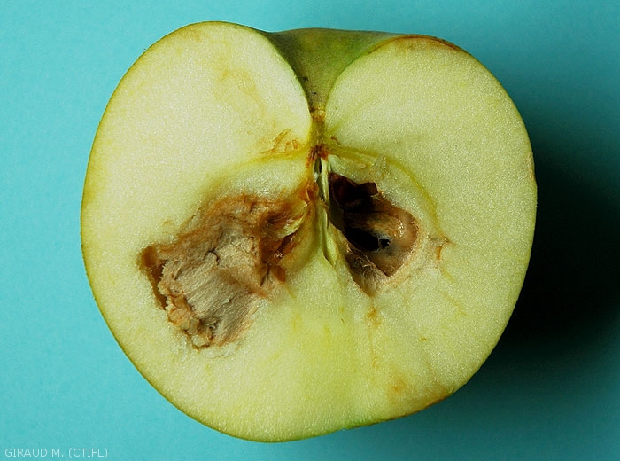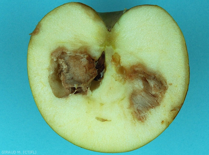 Brunissement interne avec une localisation variable, mais surtout péricarpellaire, qui peut s’étendre par la suite à toute la chair (figures 1, 2 et 3). Les tissus malades perdent de l’eau, ce qui provoque la formation de crevasses ou de cavernes plus ou moins étendues. La présence de cavernes ou de crevasses est possible en absence de brunissement.