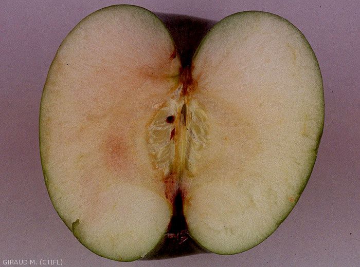 Symptômes uniquement interne, montrant à la coupe une coloration rose de la zone carpellaire, évoluant vers le brun (figures 1 et 2). Aucun symptôme extérieur visible.