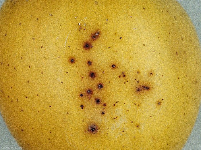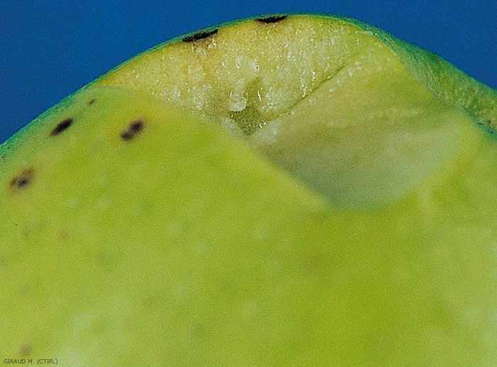 Petites taches circulaires brunes autour des lenticelles, avec nécrose superficielle des tissus (1 mm), à contour plus ou moins net (figures 1 et 2). Les symptômes s’accentuent lorsque le fruit se déshydrate.