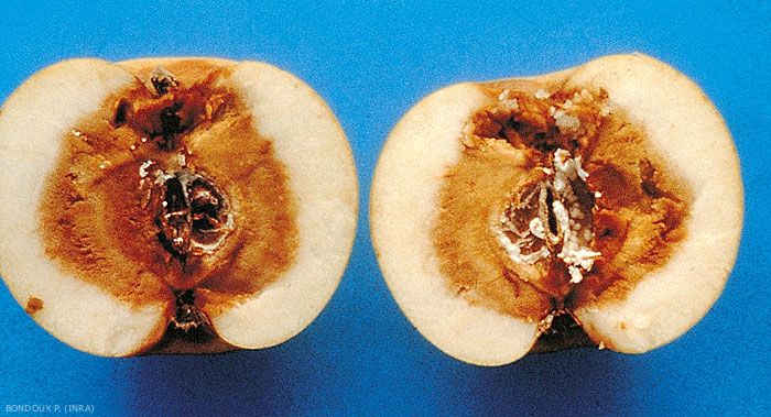 Le goût amer de la partie saine de la chair est caractéristique. La pourriture de cœur est brune, avec un feutrage rose dans les loges (figure 2).