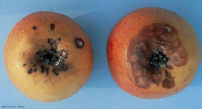 Taches lenticellaires de petite taille, arrondies ou ovales, sèches, brunes, avec la partie centrale plus claire, situées généralement autour de la cuvette oculaire (figure 1). Pourriture brune autour des taches de tavelure.