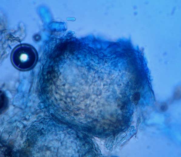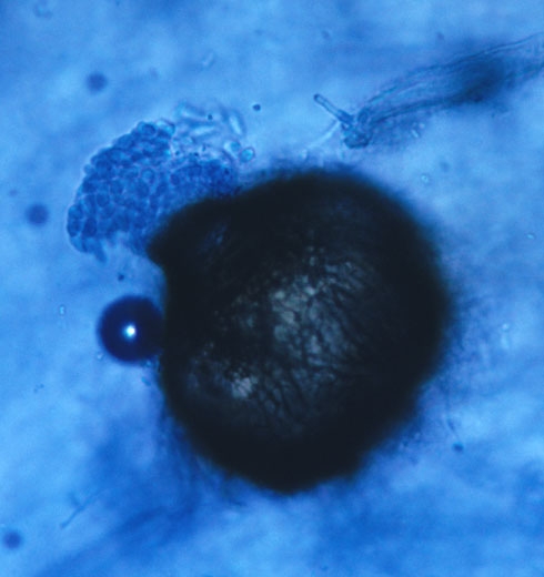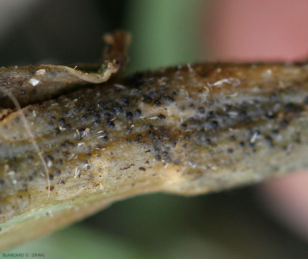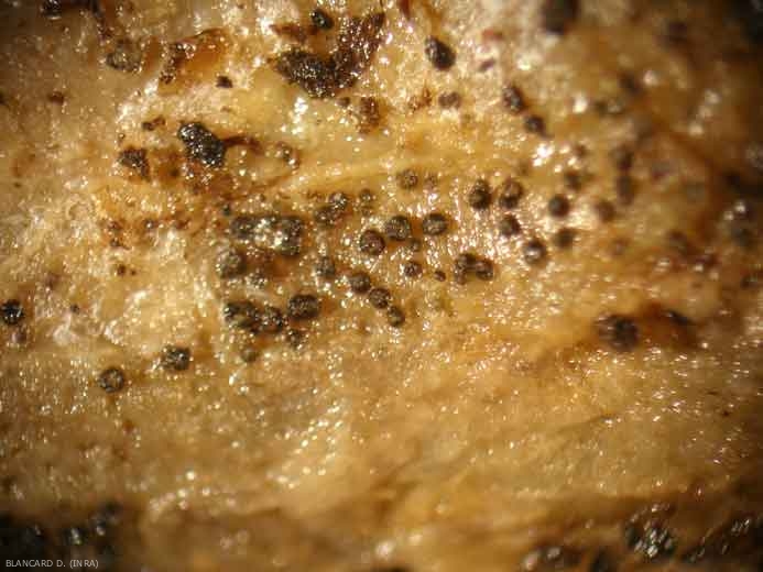 - Minuscules et nombreuses masses globuleuses brunes à noires, qui persillent les lésions, ce sont les fructifications visibles à la loupe de ce champignon ;
