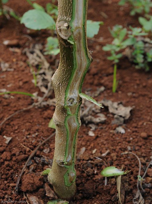 - Coloration jaunâtre à brune du système vasculaire dans la tige et les racines ; la moelle et le cortex peuvent présenter des lésions humides et brunes à terme.