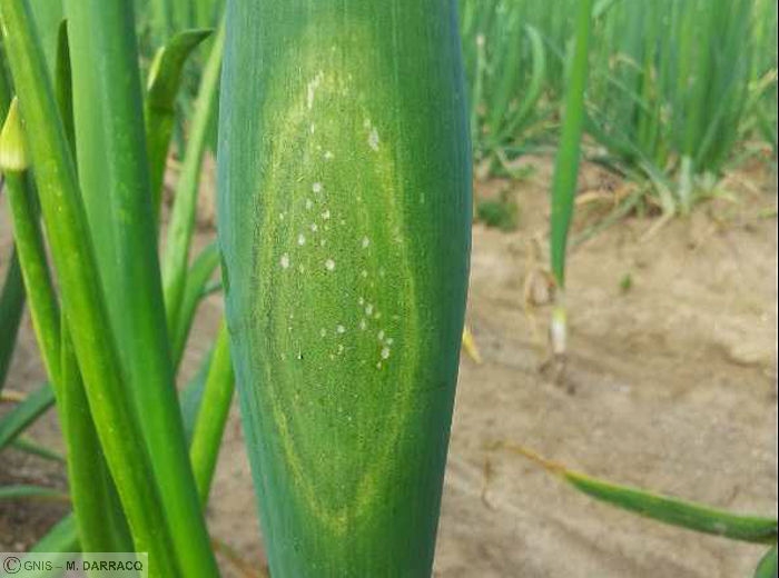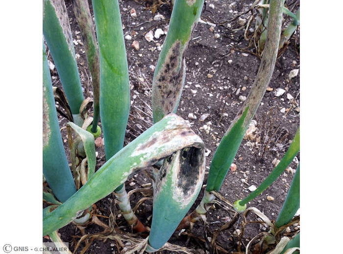 En cours de végétation : présence de taches allongées sur feuilles et hampes d’aspect jaunâtre et recouvertes d’un feutrage gris. En vieillissant ces taches sont souvent recouvertes de champignons secondaires (du genre Stemphylium ou Alternaria) qui se développent en saprophytes.