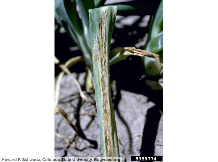Présence principalement sur les feuilles de taches blanchâtres et humides évoluant vers un aspect de brûlures à