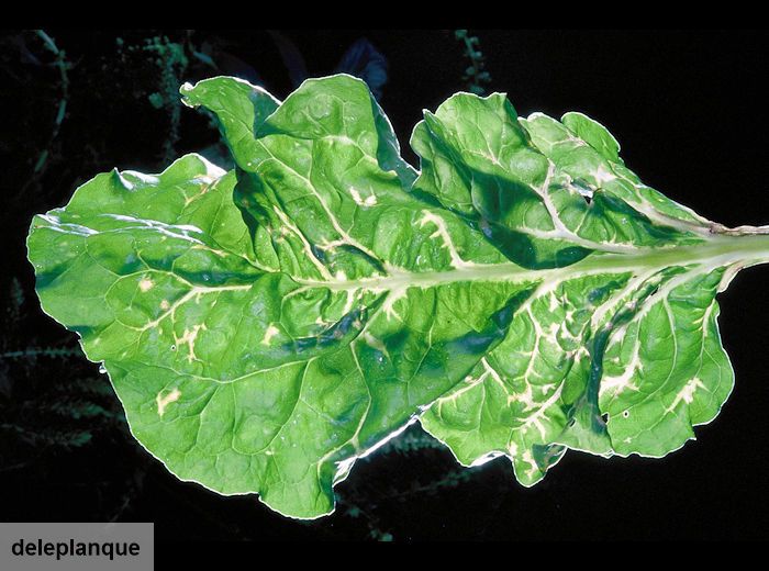 Sur feuilles : à la fin de la période de croissance et après une averse, elles sont de teinte vert très pâle, devenant translucides et verticales. Le jaunissement foliaire suivi d'une nécrose le long des nervures est tout à fait caractéristique mais peu fréquent.