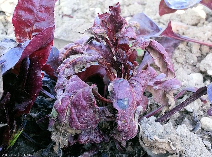 Les feuilles du cœur prennent une teinte vert clair, se gaufrent et s’épaississent. Puis, apparition d’un duvet gris violacé à la face inférieure des feuilles. Apparition de la maladie en automne et/ou en sortie d’hiver sur pépinières ou semis directs.