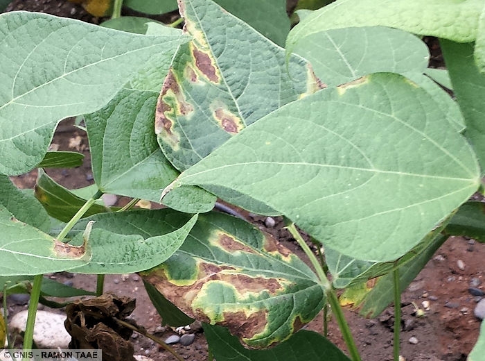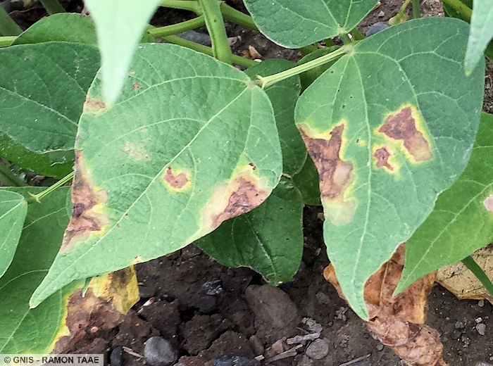 Sur feuilles : grande nécrose brune irrégulière bordée d’un halo jaune vif, évoluant vers un aspect brûlé du feuillage jusqu’à défoliation. Cet aspect brûlé le distingue d'une infection par Pseudomonas savastanoi pv. phaseolicola, d'aspect plus jaune. Une décoloration brun rougeâtre des nervures et une imbibition des tissus adjacents peuvent également être observées.
