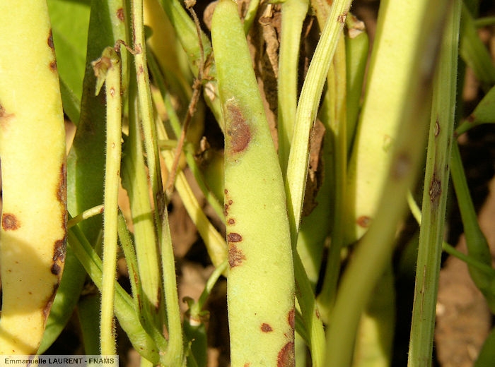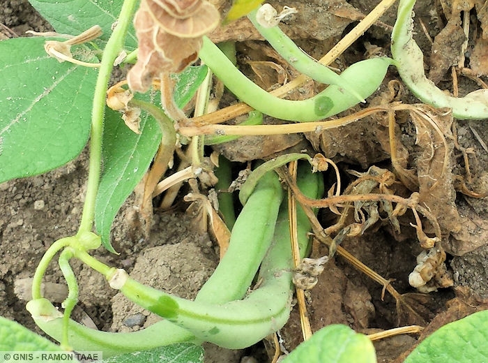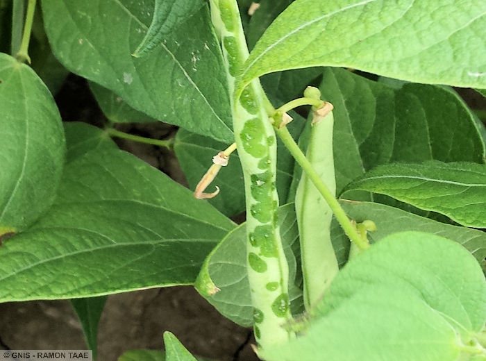 Sur gousses : taches graisseuses irrégulières plus ou moins bordées par une couronne brun rouille, avec apparition d’exsudat jaune en cas de forte infection.
