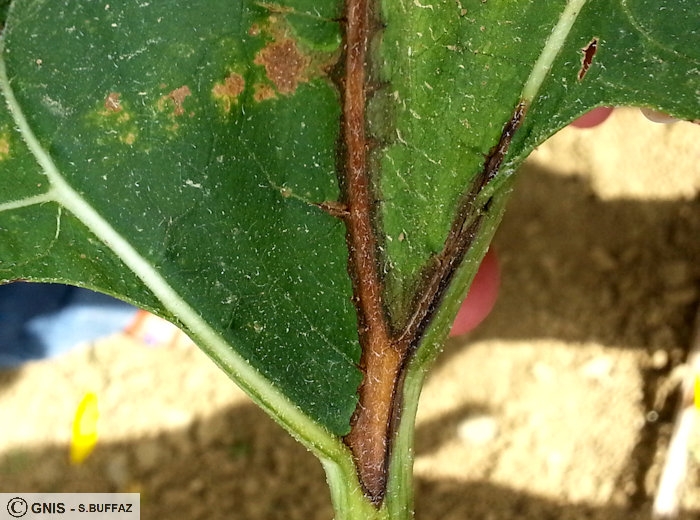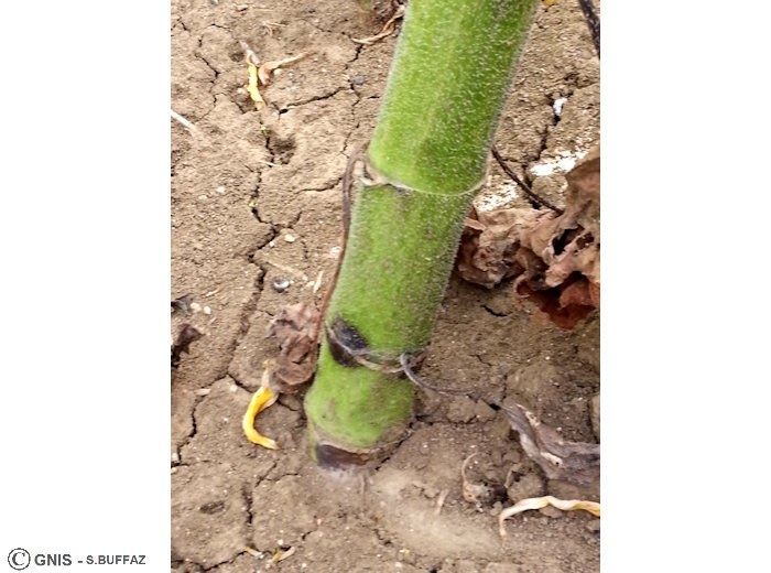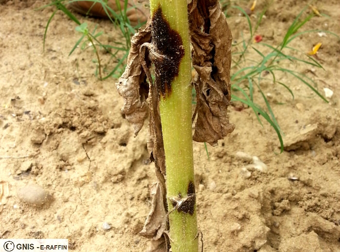 Sur tiges : taches noires aux contours nets, arrondies et centrées sur le pétiole des feuilles (symptôme caractéristique), pouvant entrainer un noircissement complet de la tige.