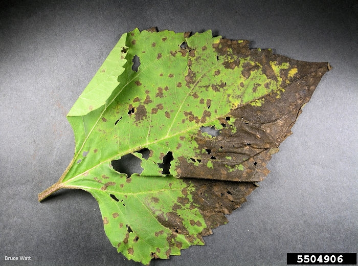 Sur feuilles : petites taches brunes entourées d’une zone décolorée jaune, situées entre les nervures et plus nombreuses au sommet. Les tissus nécrosés provoquent progressivement la perforation des feuilles.