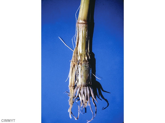 Sur tiges : pourriture se propageant de la base vers le haut ou de haut en bas de la plante.