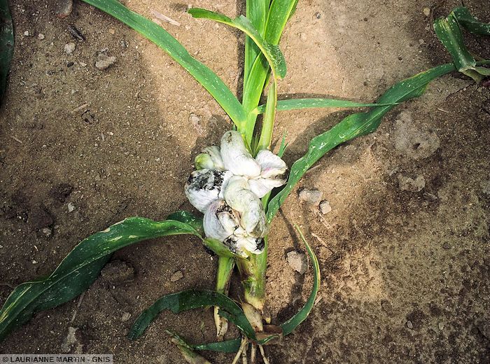 Présence de tumeurs charbonneuses recouvertes d’une enveloppe blanche sur les organes jeunes en croissance, les apex, les inflorescences mâles et femelles, les feuilles, les tiges au niveau des bourgeons axillaires, les épis.