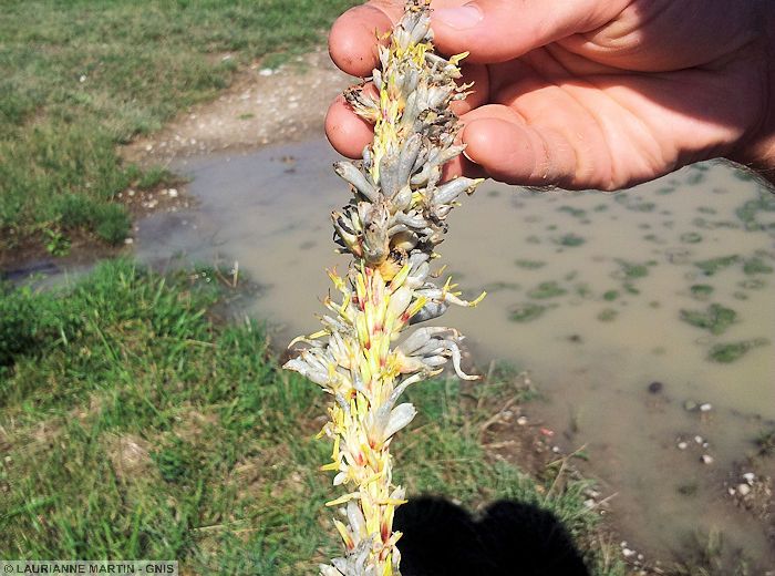 Sur épis : excroissances à la place des graines, conférant une allure de grappe et libérant des spores noires à maturité.