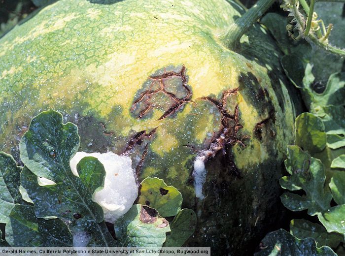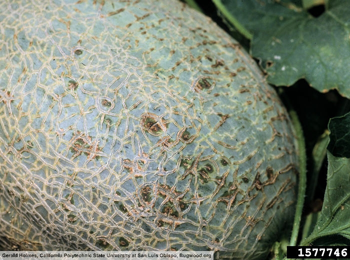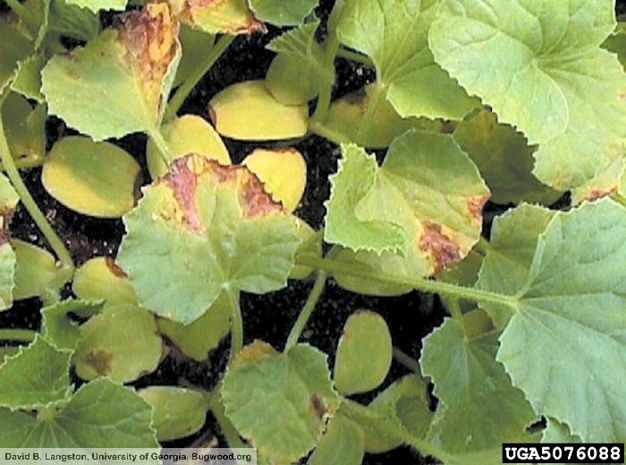 Acidovorax citrulli est une maladie bactérienne qui touche particulièrement la pastèque et le melon, et seulement sur feuilles chez le concombre et la courge.