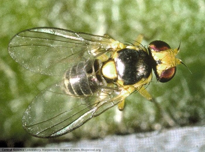 - adulte : petite mouche de 1,5-2,5 mm de longueur, couleur jaune et noire