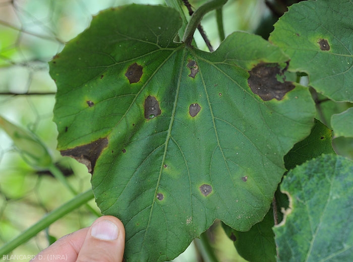 Par la suite, les taches s'étendent, brunissent, et se nécrosent progressivement (figures 3 à 5). Un halo jaune peu marqué les ceinture (figure 6). Leur diamètre peut être bien supérieur au centimètre. Elles coalescent parfois.