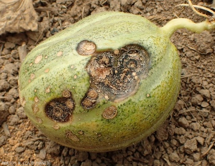 Des altérations sur les fruits en pré et post-récolte. Sur melon, elles ont une forme plutôt circulaire, une couleur sombre et sont plus ou moins concaves (crater rot symptom), mesurant plusiueurs centimètres de diamètre. La chair sous-jacente pourrit progressivement. Les tissus superficiels peuvent rompre.