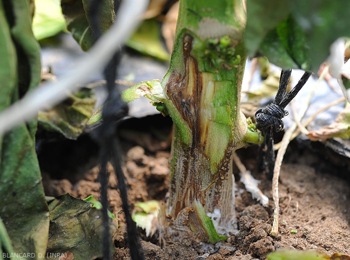 - Lésion humide et sombre au collet (particulièrement vulnérable) évoluant en pourriture, et le ceinturant progressivement sur plusieurs centimètres. Les tissus du cortex atteints brunissent plus ou moins intensément et se décompose progressivement (figures 1 et 2). Les tissus vasculaires sous jacents peuvent brunir (figure 3).
