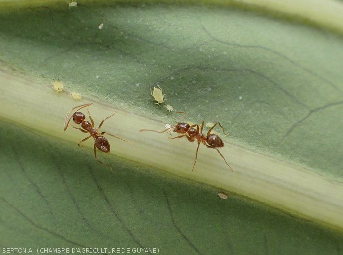 - Larves et adultes souvent présents à la face inférieure du limbe, se nourrissant grâce à leur rostre. Le sucre en excès contenu dans la sève est rejeté sous la forme de miellat.