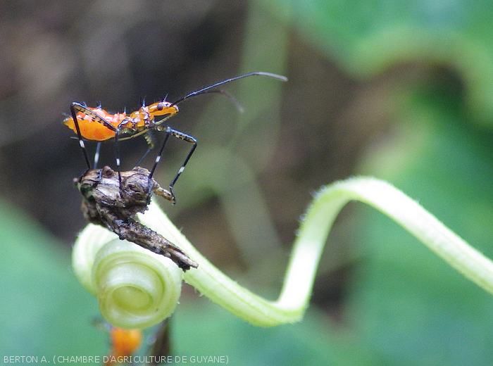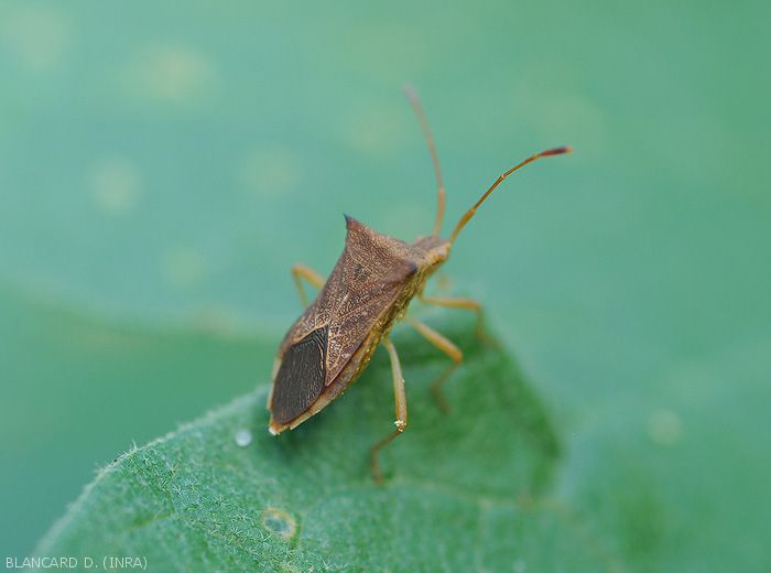 - Punaise parasitant de nombreuses plantes comme le soja, le riz, divers légumes (aubergine, concombre, tomate, poivron, haricot), ainsi que des adventices qui assurent sa multiplication et servent de sources d'infestation.