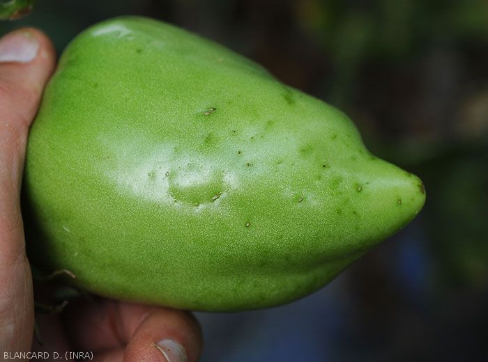 - Minuscules taches ponctiformes (figure 2) sur jeunes fruits autour desquelles la coloration des tissus sous-jacents est plus claire que le reste.