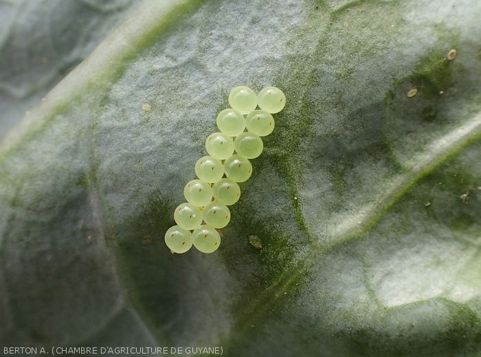 - Oeufs, blanc cassé, en forme de petits tonnelets regroupés en nids d'abeilles à la face inférieure des feuilles.