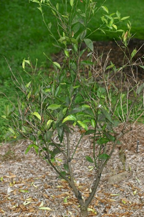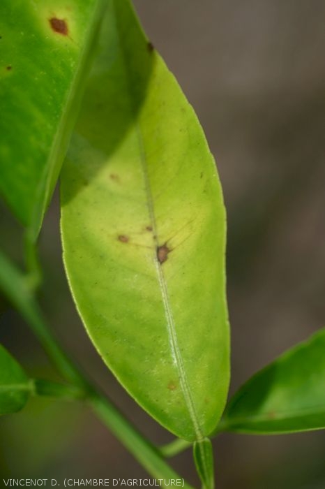- Feuilles et fruits : présence de petites taches foncées entourées d'un halo plus clair.