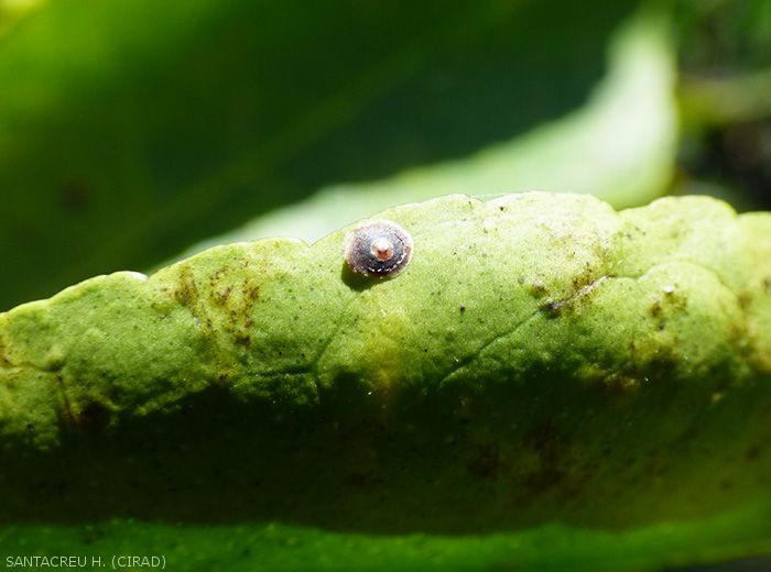 C’est une cochenille diaspine, elle est cosmopolite et polyphage. Elle s'attaque exclusivement aux feuilles et fruits et montre en général une dispersion assez lente au sein d'un verger, bien que l'infestation puisse être très importante au sein des arbres attaqués.