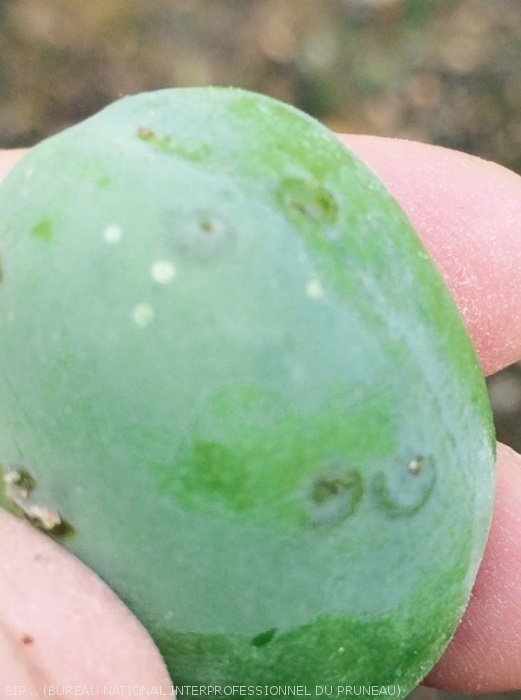 Les fruits attaqués présentent des perforations en forme de spirale. Des écoulements gommeux caractéristiques peuvent alors être observés. Ils correspondent à une défense naturelle des fruits. Avec un peu d'attention, et à l'aide d'une loupe, il est possible d'observer une ou des traces d'oeufs à proximité de la perforation.