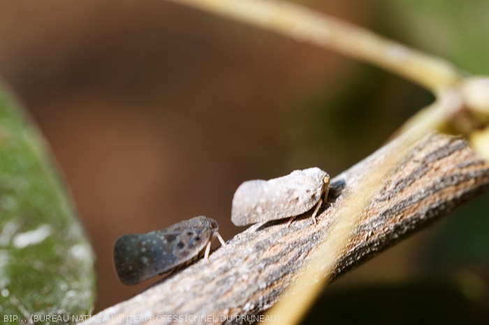 Les adultes, d’environ 7 à 9 mm, apparaissent au mois de juillet et se nourrissent de la sève des rameaux qu’ils colonisent en nombre, occasionnant alors des dégâts :