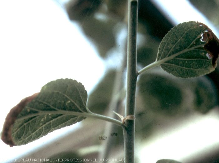 En été, les jeunes feuilles du sommet des rameaux peuvent également présenter des symptômes. Elles sont plus petites et plus arrondies que la normale. Elles se creusent. La pointe du limbe jaunit et se nécrose.