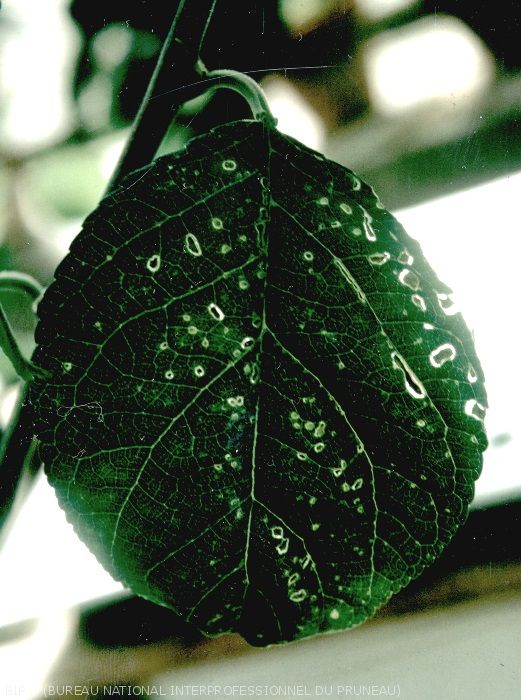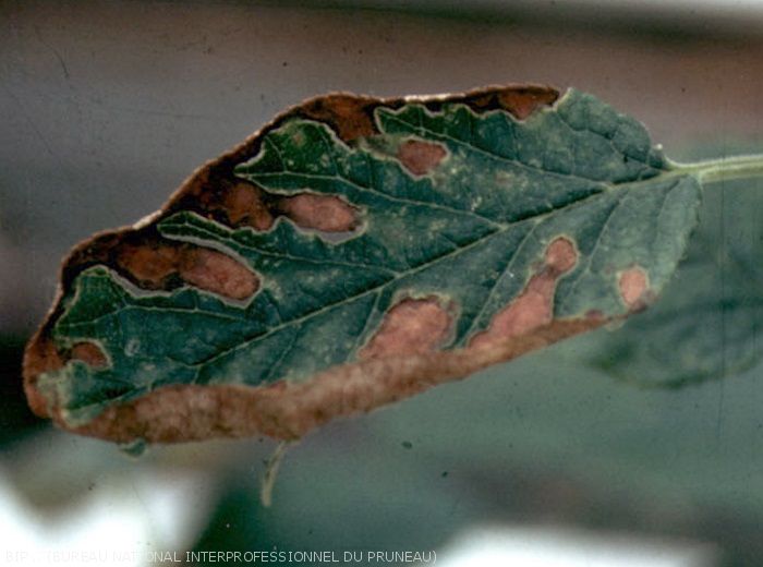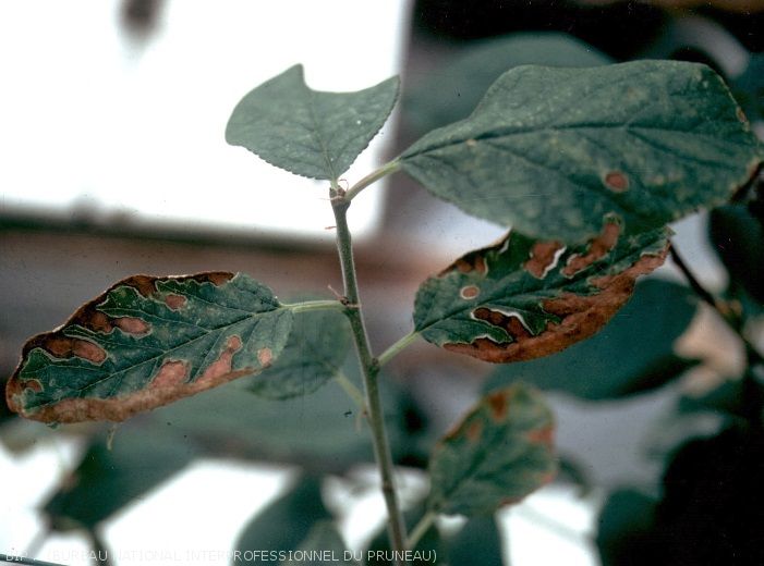 En fin de saison, sur jeunes feuilles, des nécroses internervaires symétriques peuvent être visibles. Toutes les taches nécrosées peuvent tomber et donner aux feuilles un aspect criblé. Ces criblures ont alors une forme arrondie mais irrégulière.