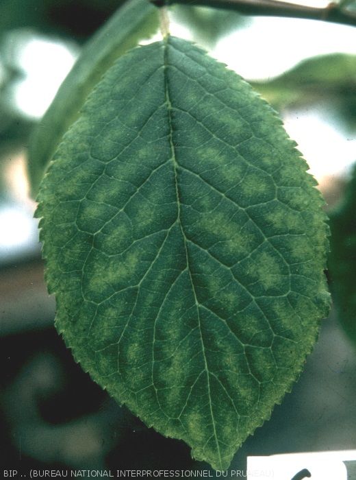 Une décoloration intense entre les nervures apparaît dès le début de saison, sur les feuilles de la base des rameaux. Le réseau des nervures principales apparaît nettement, entouré d’une zone qui reste bien verte. Ne pas confondre avec la chlorose ferrique.