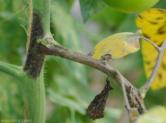 • Lésions chancreuses brunes sur apex, tiges et pétioles, plus ou moins étendues, et au contour irrégulier (figures 4 à 6).