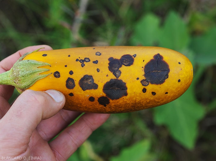 Taches circulaires humides s'étendant, brunissant et noircissant progressivement sur les fruits au fur et à mesure de leur maturation (figures 6 et 7). Les taches sont légèrement concaves et peuvent coalescer, et provoquer une pourriture de secteurs importants des fruits (figure 7), voire les dégrader entièrement. Altération des graines qui prennent une teinte rouille.