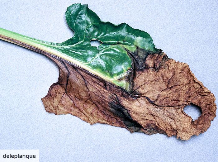 Flétrissement des feuilles externes de la couronne, qui se dessèchent puis meurent (souvent, seule la moitié de la feuille est atteinte, pétiole compris).