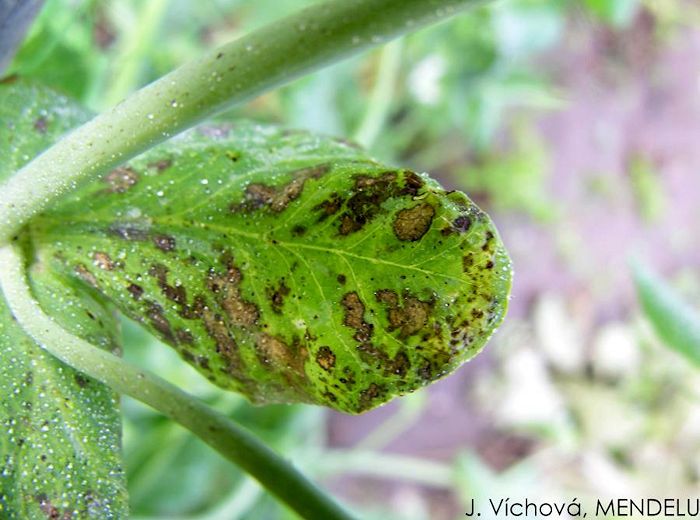 Sur feuilles : petites ponctuations noires pouvant s'agrandir et se rejoindre pour former de larges taches foncées.