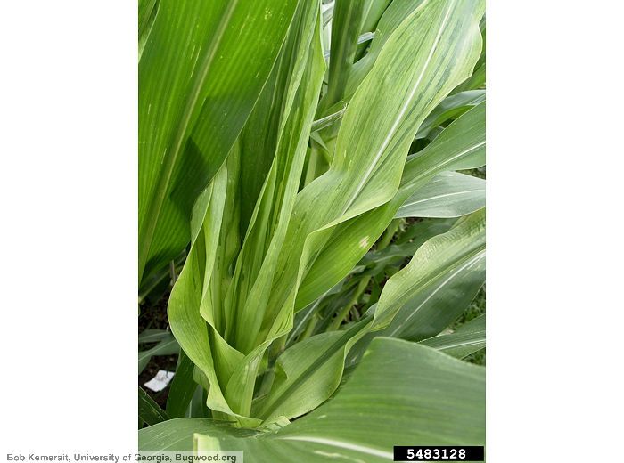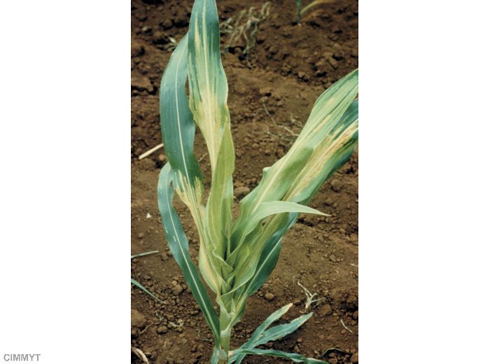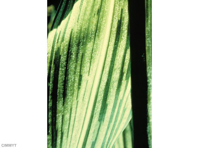 Sur feuilles : longues stries blanches à jaunes, devenant nécrotiques et brunes. Duvet grisâtre sur la face inférieure. En cas d’infection systémique, sévère chlorose à la surface des feuilles.
