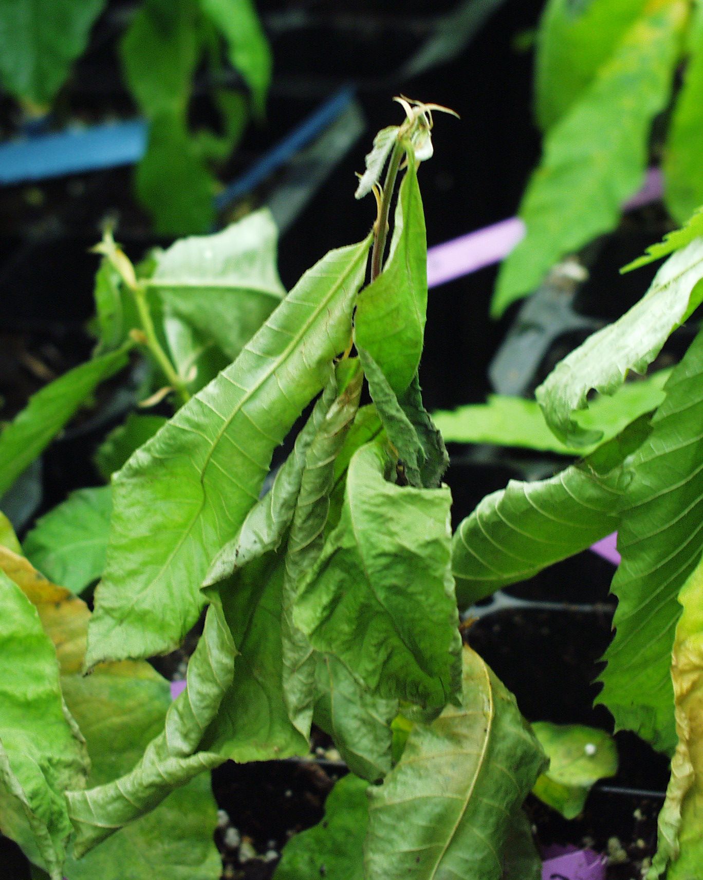 La nécrose des racines fines a comme conséquence le flétrissement des jeunes plants (Figure 5), ce flétrissement est surtout visible en période de stress hydrique chez les arbres adultes et se traduit par un déclin, ou dépérissement, sur une période plus longue.