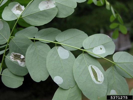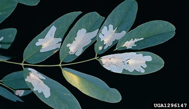- Macrosaccus (=Phyllonorycter) robiniella : mine ovale à la face inférieure de la feuille, qui transparait face supérieure.