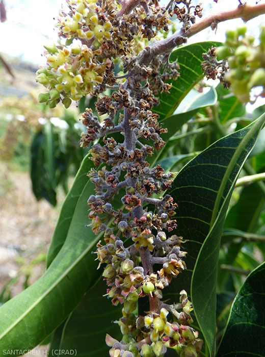 L'anthracnose causée par Colletotrichum gloeosporiodes : taches noires, en forme d'épingle, sur les fleurs et les panicules ; les fleurs mortes deviennent noir d'encre alors que pour l'oidium les panicules sont couvertes d'un voile gris blanchâtre ; les fleurs mortes deviennent marron et grises.