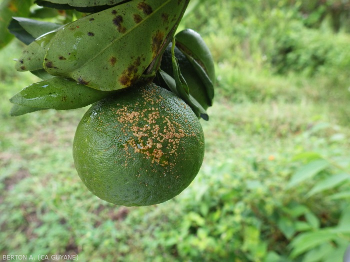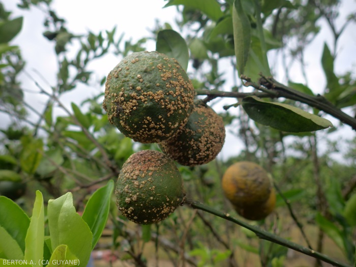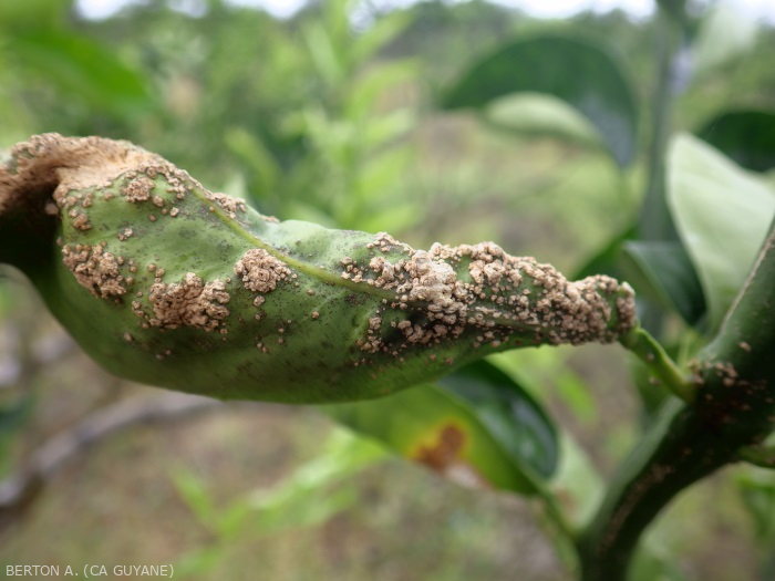- Fruits : pustules liégeuses irrégulières (voir photo 2). Infectés aux premiers stades de leur développement, les fruits se déforment et sont sujets à une chute prématurée. Les fruits infectés ne peuvent pas être commercialisés.