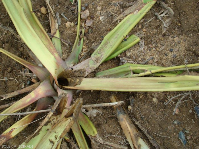 Les espèces de Phytophthora pathogènes sur l'ananas sont : Phytophthora nicotianae, Phytophthora cinnamomi et Phytophthora palmivora proche du Phytophthora parasitica. Le premier infecte plutôt les parties aériennes du plant, le second pénètre par les racines (maladie du root rot qui peut aussi être due aux Pythium spp.). Les deux causent une pourriture du cœur du plant.