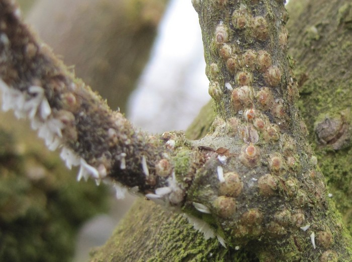 S’il y a une attaque massive de la cochenille, le tronc et les branches principales peuvent être couvertes de taches blanches formées par l’accumulation de boucliers (figure 1).