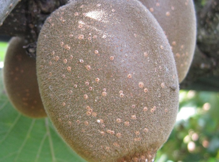 La cochenille du mûrier peut entrainer des déformations et décoloration sur le fruit, jusqu’ici uniquement constatées sur pêches. Les boucliers présents sur les kiwis (figure 2) les rendent impropres à la commercialisation, ils doivent donc être jetés bien que consommables.
