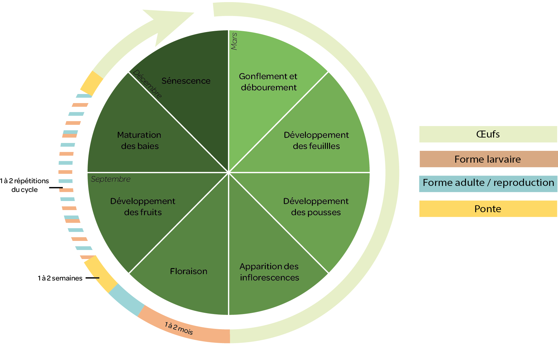 La cochenille fait 2 à 3 générations par an (2 générations/an dans la vallée du Rhin, 3 générations/an dans le Sud-Ouest de la France).